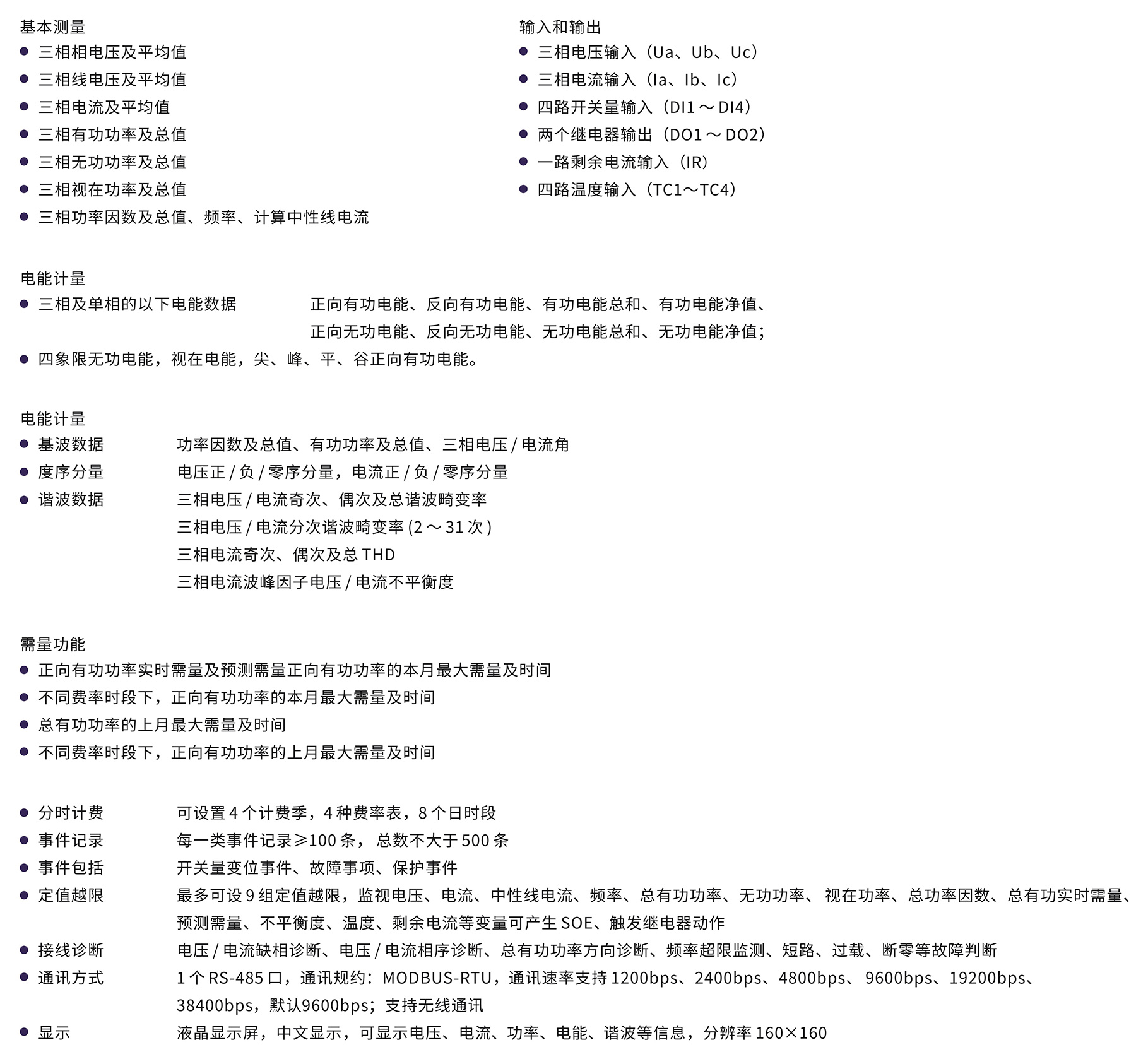 JKG系列采用中文液晶顯示,以工業(yè)級微處理器為核心,處理速度高,具有很高的性價比。能夠提供高精度的三相電壓、電流和功率等基本測量數(shù)據(jù),并具有復(fù)費率、需量計算、諧波計算、歷史電能記錄、最大最小值記錄、定值越限等功能;通過RS-485通訊方式與上位機(jī)實現(xiàn)數(shù)據(jù)交換,可實現(xiàn)智能化的電能管理。